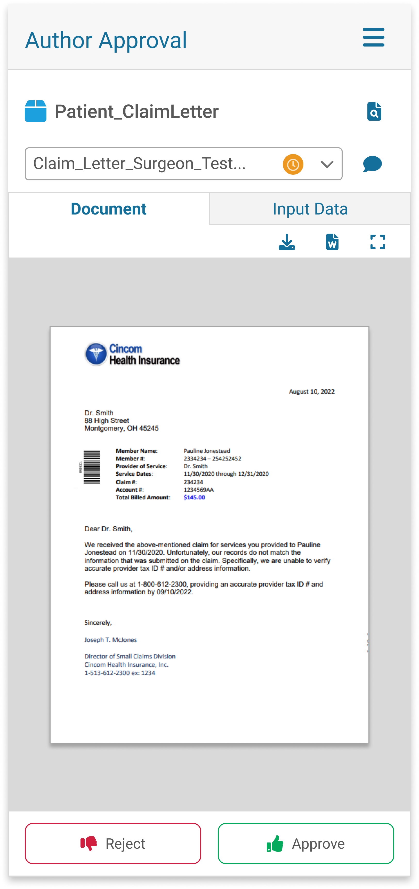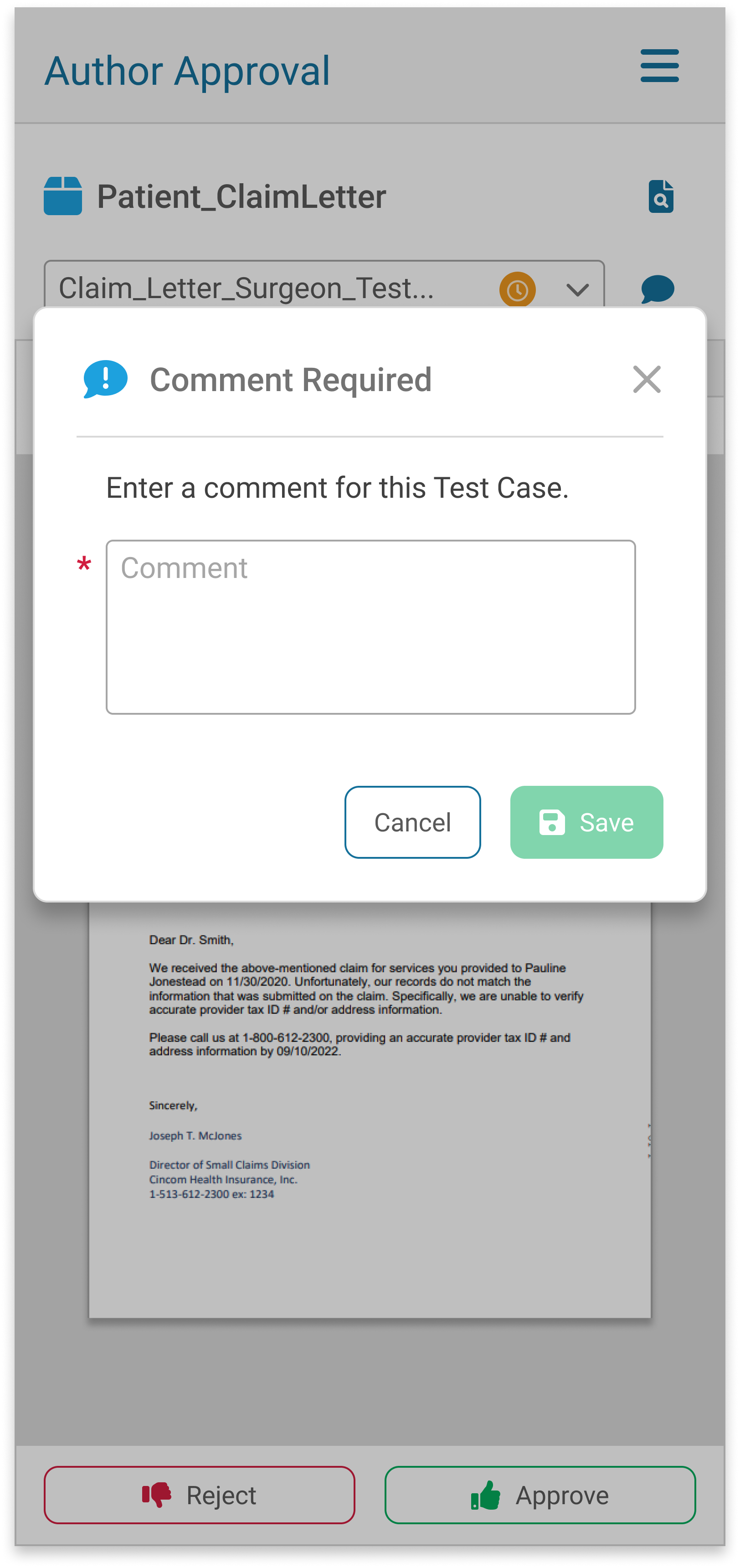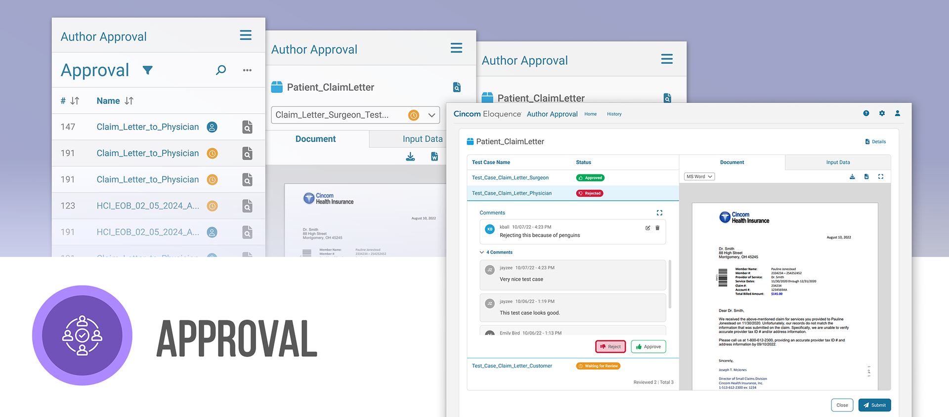 An Author Approval package can include many parts - for example, versions of a communication for multiple states, each with an email and a printed document. Reviewers can comment on any version, and a second reviewer repeats the process. The UI had to be clear, so we ran several rounds of usability testing and iteration during the initial design.